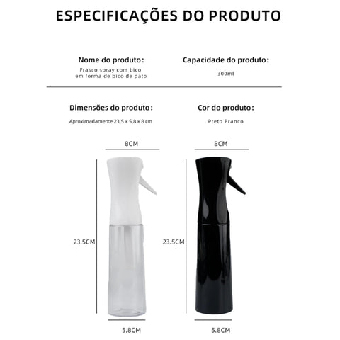 O frasco de spray com bico em formato de bico de pato é prático, resistente e versátil, ideal para uso profissional de tatuadores, garantindo higiene e praticidade durante o atendimento. Com capacidade de 300ml, proporciona uma névoa fina e uniforme, permitindo maior cobertura e economia de produto.