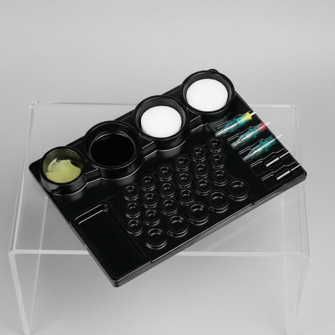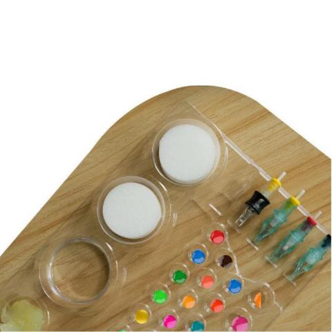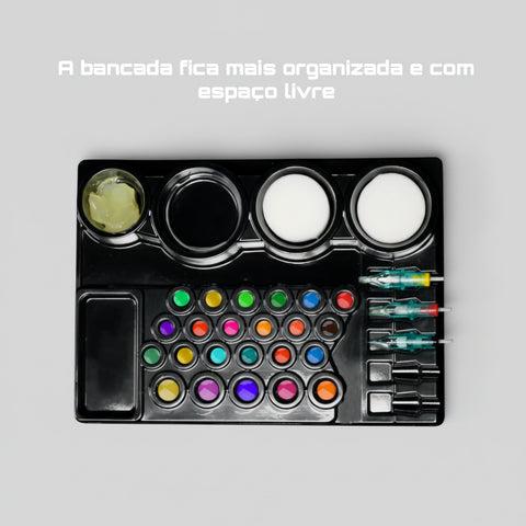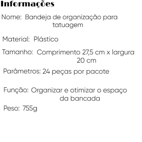 Organize seu ambiente de trabalho de forma eficiente e prática com nossas bandejas para tatuagem, projetadas para acomodar materiais essenciais, como copos de tinta, agulhas, esponjas e recipientes de lavagem. Ideais para estúdios profissionais, elas oferecem estabilidade e fácil acesso aos itens durante o procedimento.